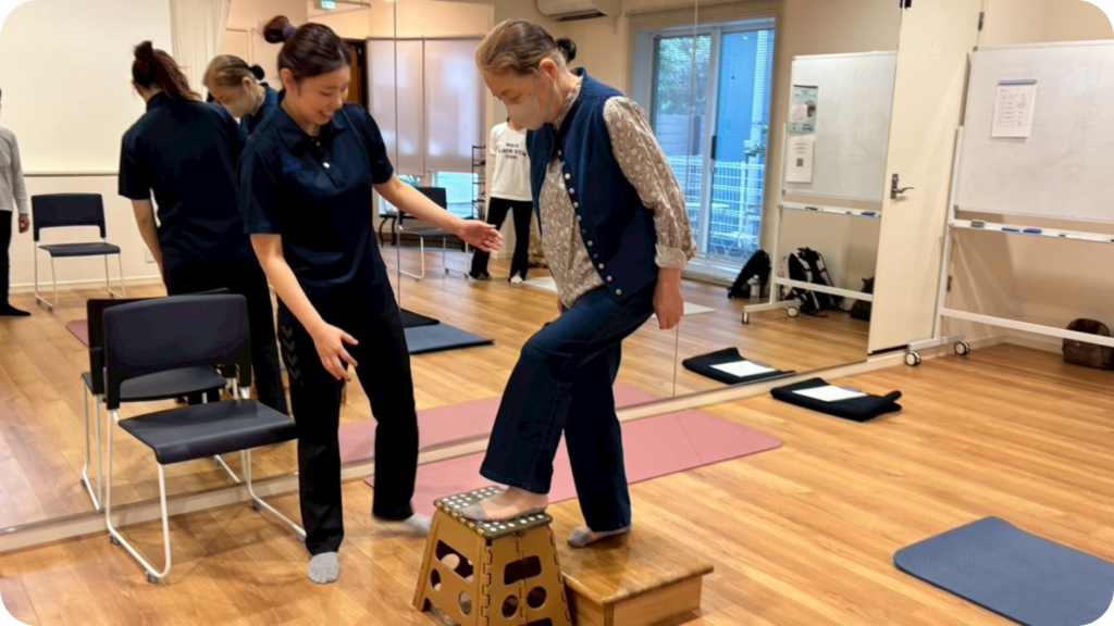 起き上がりから立ち上がりまでを通して、身体の連動性を整えます。