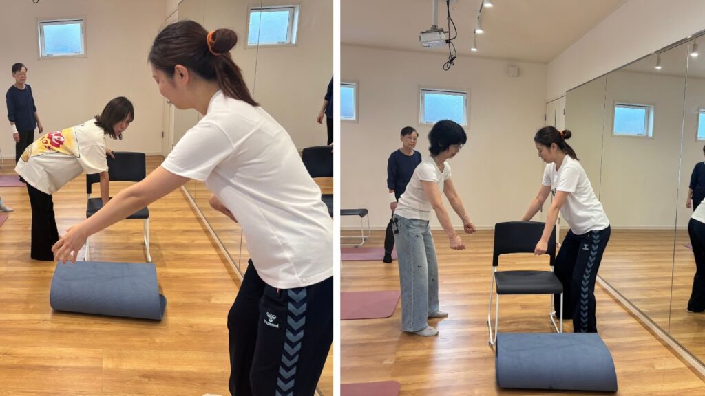 両者の違いを実際に実感していただきました。 - 負担の少ない動作に必要な、柔軟体操とエクササイズを実施